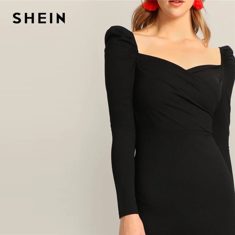Finest SHEIN Black Surplice Neck Sweetheart Puff Sleeve Split Pencil Plain Bodycon Dress Women Spring Eleg
